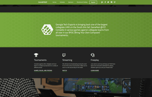 In my free time, I enjoy web development and graphic design, and have contributed to a small handful of open source projects. During my time at Georgia Tech, I worked as a maintainer on GT Scheduler, an open source scheduling application used by GT students that seeks to improve upon the course registration process. I also enjoy playing computer games and keeping up with esports. At Georgia Tech, I was an officer and then president of the Esports club, where I worked with campus administrators and external companies to secure sponsorships, host and plan events (like Gamefest), and organize resources for competitive teams.